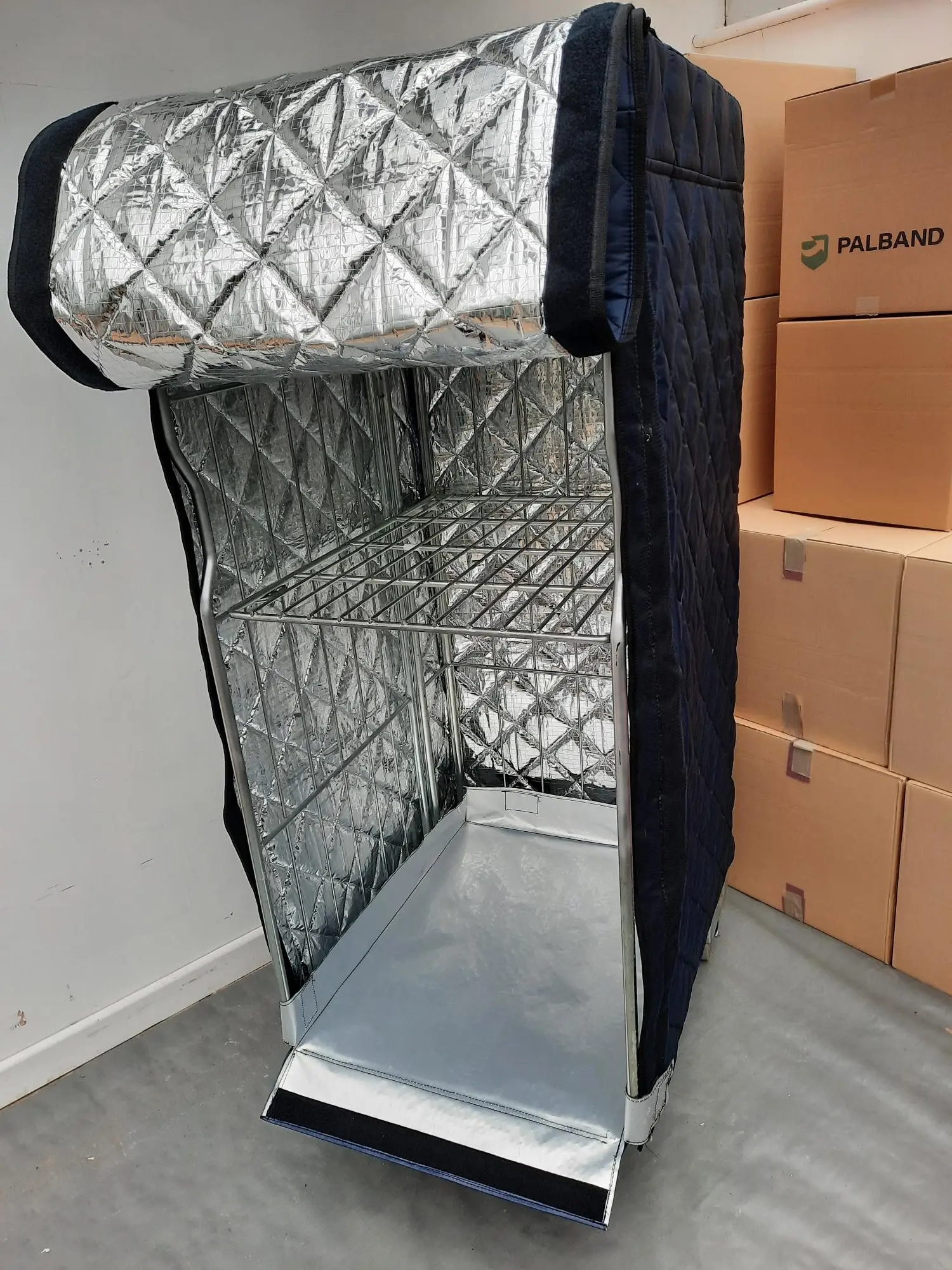 Palband developed a set of fully customised Insulated Roll Cage Covers tailored precisely to the retailer’s cage sizes and operating requirements. Each cover features a multi-layer construction with thermal insulation, a durable waterproof outer surface, and a reflective silver foil inner lining to maintain temperature consistency throughout the cold chain. The thickness of insulation was calculated to extend the safe transit window beyond the required time, providing full assurance that any short delay would not compromise food quality.